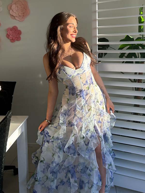 Feel Effortlessly Beautiful in This Blue Floral Ruffle Maxi Dress