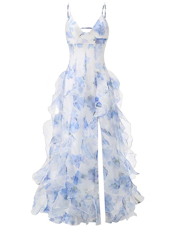 Romantic Blue Floral Ruffle Maxi Dress with V-neck Bodice & Sheer Layered Prom Dress