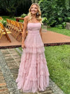 Elegant Tulle Princess Pink Strapless A-line Long Prom Dress