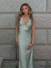 Crafted from smooth sage green satin (with soft, muted undertones) ✨, it blends earthy charm with modern allure. The halter neckline (with a plunging V-front), delicate spaghetti straps, and open low-back design create graceful, eye-catching lines, while the floor-length column silhouette skims curves for a statuesque, comfortable fit.