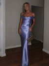 Crafted from lustrous periwinkle satin (a soft, luminous blue-purple hue) ✨, it blends whimsy with luxury. The off-the-shoulder neckline, plunging sweetheart front, and open low-back design create striking allure, while the mermaid silhouette hugs curves before flaring gently at the hem for a red-carpet-worthy finish.